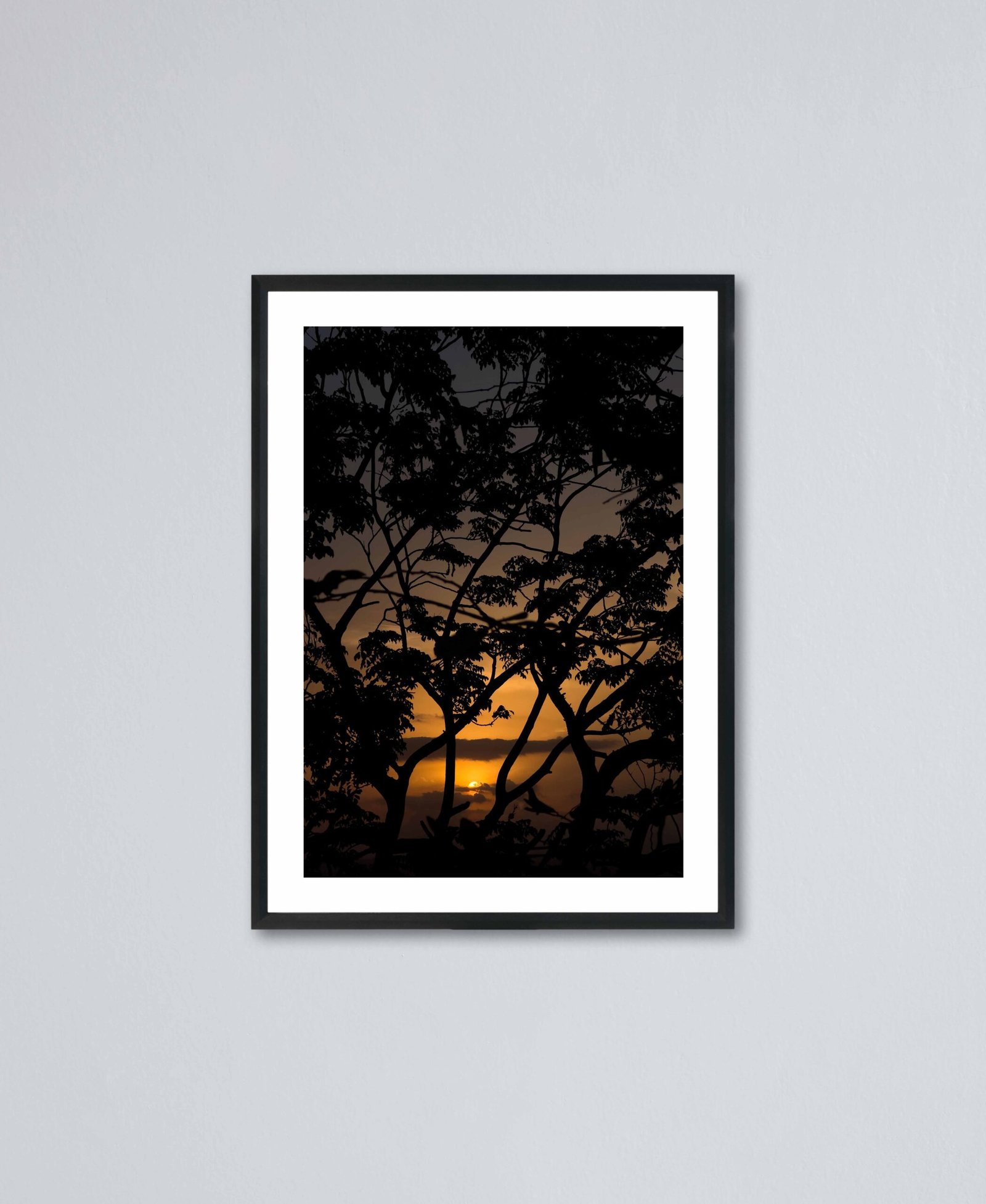 Illuminated clouds meet the bold silhouettes of trees for a serene golden sunset. Shai Hills, Ghana.