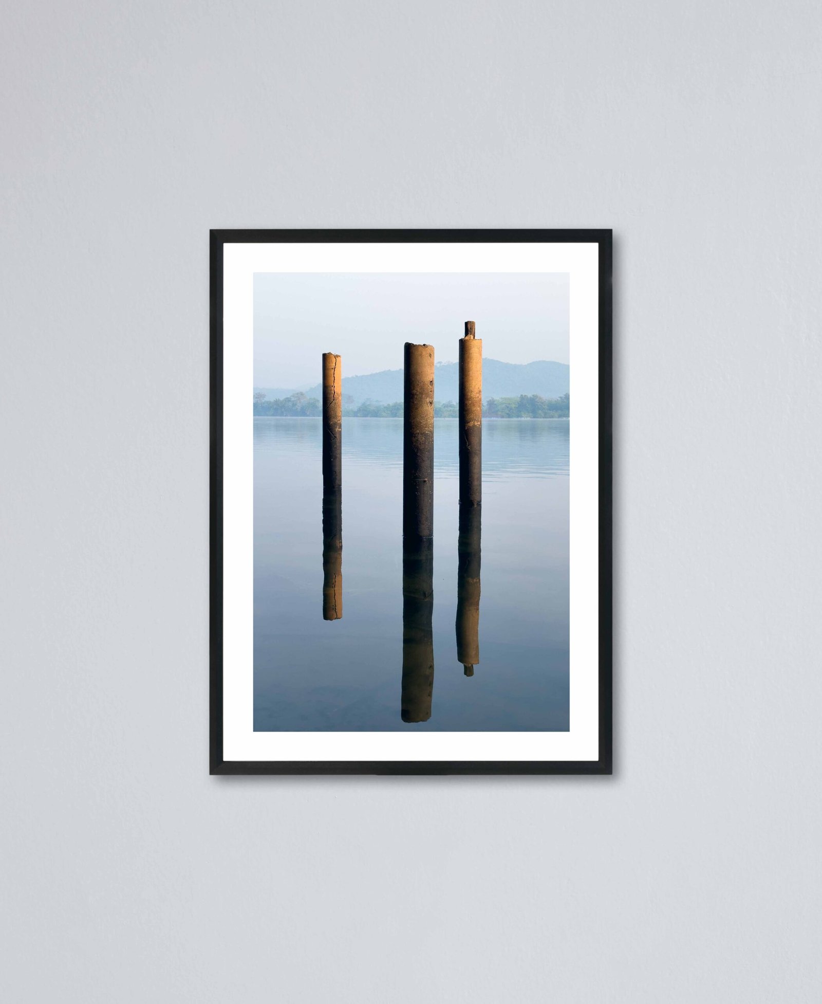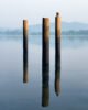 Three pillars in still waters are greeted with a beautiful sunrise as the world wakes up slowly. Akosombo, Ghana.